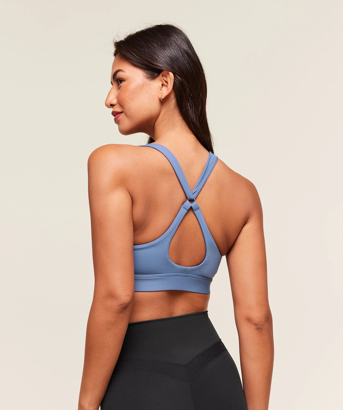 Sports Bra azul con diseño tipo "peek a boo" que ofrece un estilo moderno y soporte ligero. Ideal para entrenamientos de baja a media intensidad.